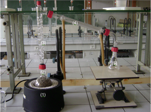 Nous l'avons placé ensuite dans un chauffe ballon (1) et relié au reste du dispositif ; à savoir à la colonne vigreux (3) raccordée au réfrigérant (4) lui-même relié à l'erlenmeyer (5).